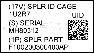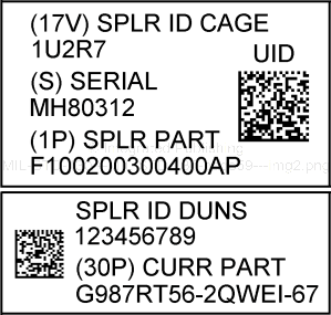 NOTE: For the UII Construct #1 mark, the PIN and manufacturer's EID changed; thus, both are changed in the new label. DI (17V) can be used to identify the manufacturer's CAGE Code because DI 25S identifies the UII without causing ambiguity when the UII is derived (see Appendix A). The data area titles for data qualifiers 25S, 30P, and 17V are not listed in ANSI MH10.8.2; therefore, the Table VIII titles were used for the mark.
