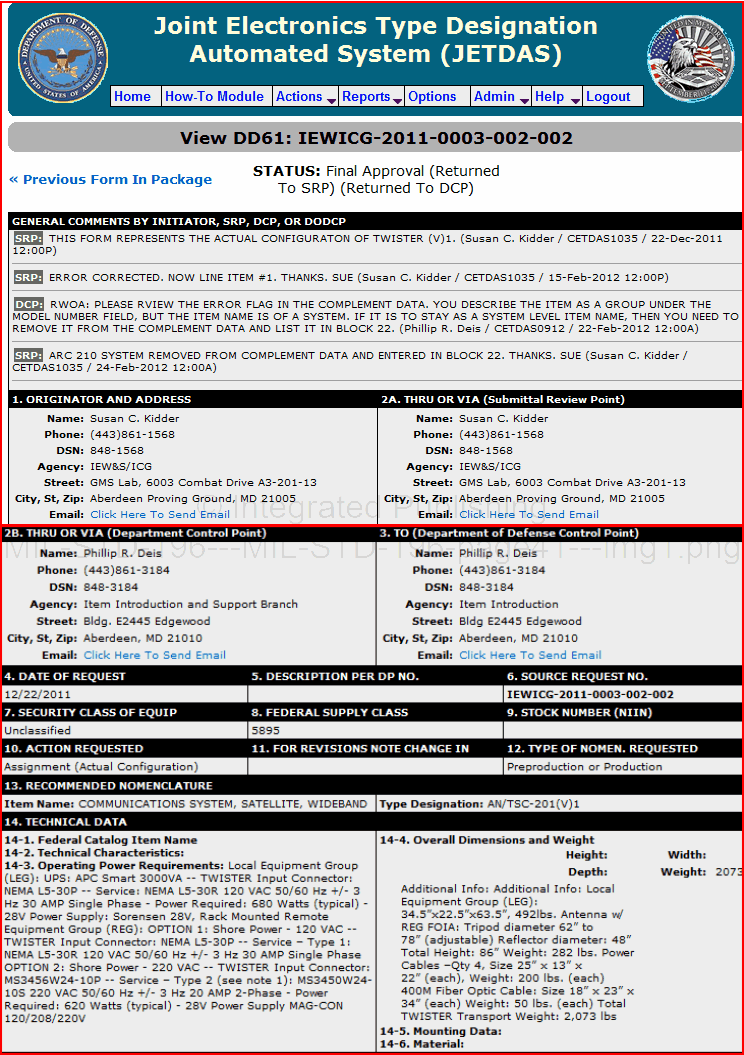 Figure 4. Request for nomenclature (DD Form 61) – Actual Configuration.